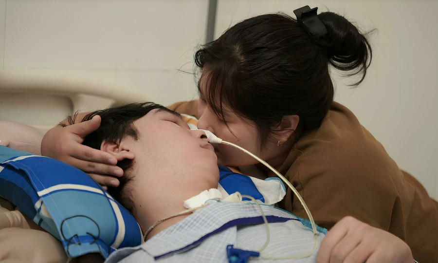 Trên giường, người yêu của Thảo, anh Trần Nguyễn Quốc Huy, 22 tuổi, nằm bất động với những đường dây truyền dịch quanh người. Nghe tiếng bạn gái thủ thỉ, anh khẽ chớp mắt.