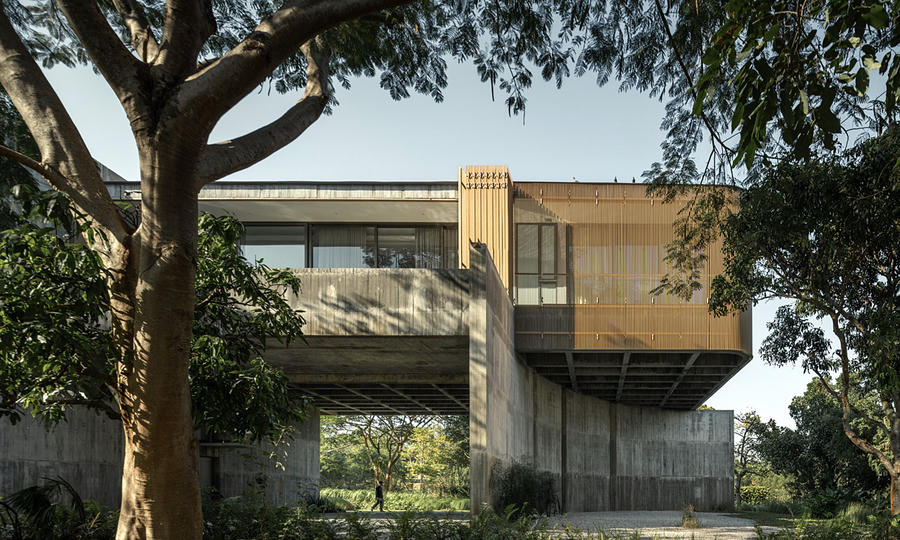 Thái LanCăn nhà một tầng được nâng cao 7 mét, tận dụng tầm nhìn toàn cảnh ra núi và cây xanh, đồng thời tạo khoảng trống bên dưới làm sân vườn cho vật nuôi.